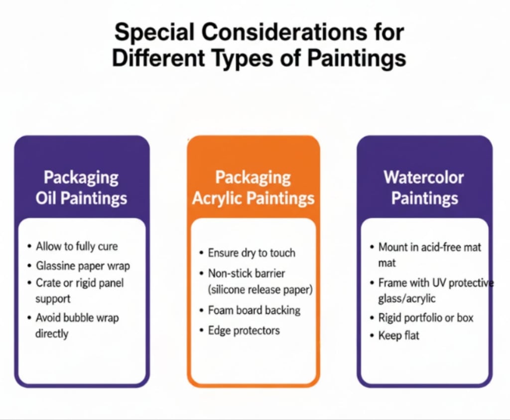 Different media react differently to temperature, pressure, and moisture. This section explains specific protective steps for oil, acrylic, and watercolor paintings so you can ship each one safely.