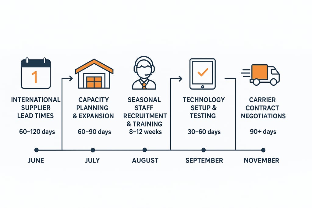 Start 6 months before your first major spike—typically June for Q4 holidays. This timeline accommodates inventory procurement (60-120 day lead times), warehouse expansion (60-90 days), seasonal hiring (8-12 weeks), and carrier negotiations (90+ days).