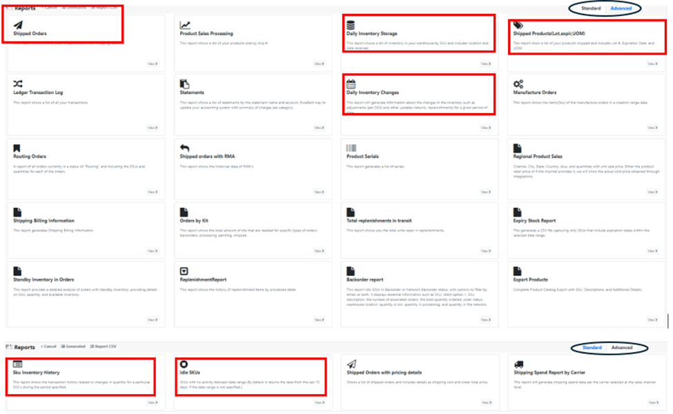 • We recommend the following reports from the Standard report Tab: Daily Inventory Storage, Daily Inventory Changes, Shipped Orders, and Shipped Products.